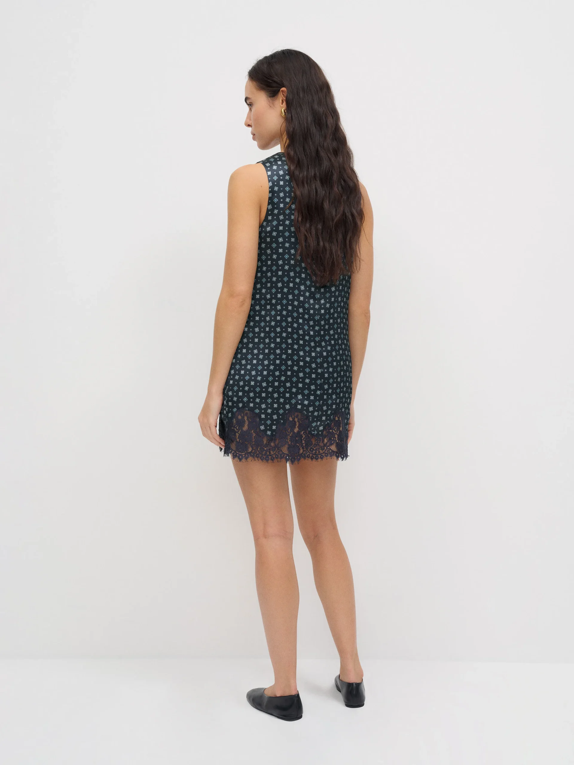 This silk mini dress with a high neckline and delicate lace hem detailing is crafted for refined elegance and repeat wear. The smooth silk fabric drapes beautifully offering a luxurious feel while remaining lightweight and comfortable. The high neckline adds sophistication while the lace hem introduces a feminine finish that elevates the overall design. Its mini length keeps the look modern making it suitable for both day and evening styling. The Windsor shade enhances its versatility allowing effortless pairing with heels or flats. Ideal for dinners events or polished casual wear this dress is designed for women who appreciate timeless silhouettes with subtle detailing. A wardrobe essential that blends elegance comfort and understated luxury.